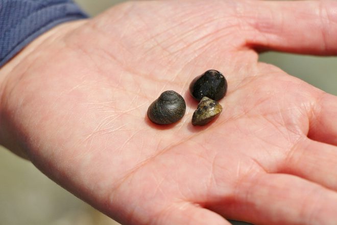 カラマツガイ(上)は肺呼吸をする有肺類で、干潮時にエサをとるために少し移動し、満潮になると元の場所に戻るそうです。一方、よく似てはいますがマツバガイ(下)は巻き貝のなかまなのだそう。素人目だと、どれも「ただの貝」にしかみえずなかなか関心を寄せにくいものですが、こうしてちょっとした生態を知ることができるのも観察会ならではといえます。