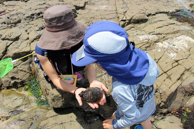 「身近な海の自然にふれてみたい」「生きものの名前や特徴を知りたい」。そんなニーズに応えるべく行われているのが、ネイチャーおおさか(公益社団法人 大阪自然環境保全協会)が主催する自然保護を目的とした各種イベント。海や川などの水辺や山々をフィールドに、月間10数回にわたって開催されています。大阪府・みさき公園にほど近い長松海岸で開催される自然観察会もそのひとつ。採取ではなく、あくまで観察。海の生きものと出会って、束の間のひとときを共有しつつ、やがては生きものともお別れ。子どもたちにとって大人にとって、観察会は大切なものは何かを会得するのに絶好の機会です。