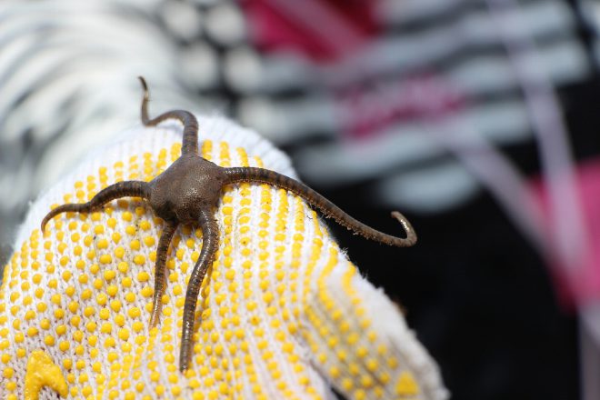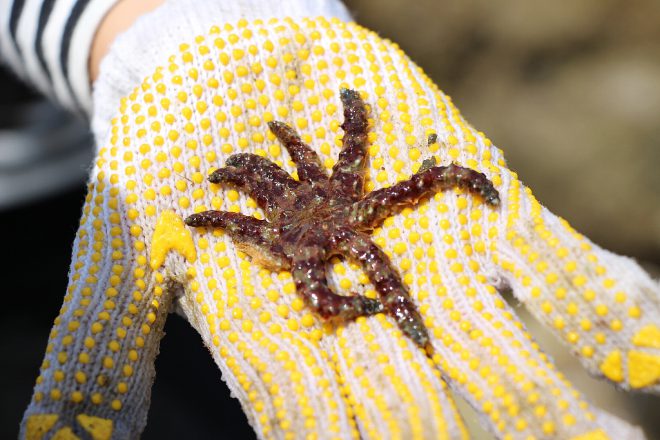 こちらはヤツデヒトデ。「八ツ手」なのに9本足(笑)。これも女の子がゲット。ちなみにこの家族、みさき公園にはよくくるそうで、ジェットコースターからみえる長松海岸が以前からずっと気になっていたそうです。なるほど、そんな参加動機もあるんですね。