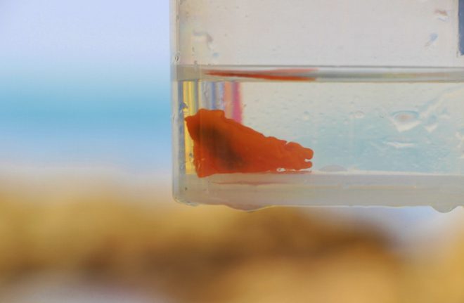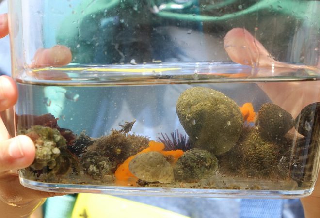 早速、ウミウシをみつけた親子が。おお~、これがウミウシですか。鮮やかなオレンジ色が特徴で、キヌハダウミウシという種類だそうです。記念すべきウミウシとの初対面となりました。