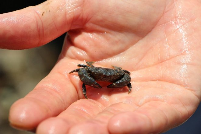 続いてオウギカニ。甲羅が扇のかたちをしているためこの名がつきました。あ、言い忘れてましたが観察会には軍手などをお忘れなく。