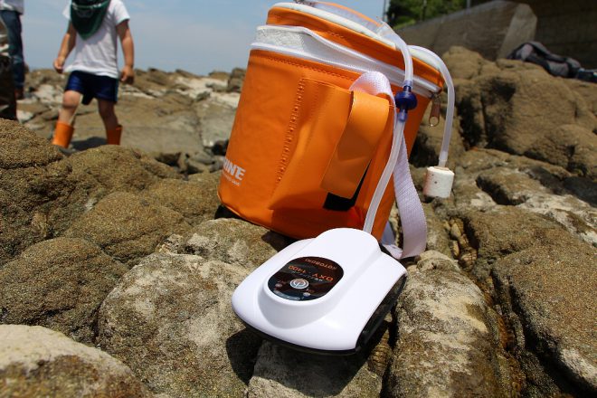 ん?どこかでみたことのあるようなツール発見。おお~、これはKOTOBUKIの充電式エアポンプ「オキシー1400」ではないですか!何でこんなの持ってるの?「こんなものが欲しかったんですよ~!」とちなちゃん。電源がなくても使える充電式エアポンプなので、USBにも対応。海での観察会には欠かせないツールなのだそう。ちなちゃん、観察会でどんどん広めていってね~(笑)