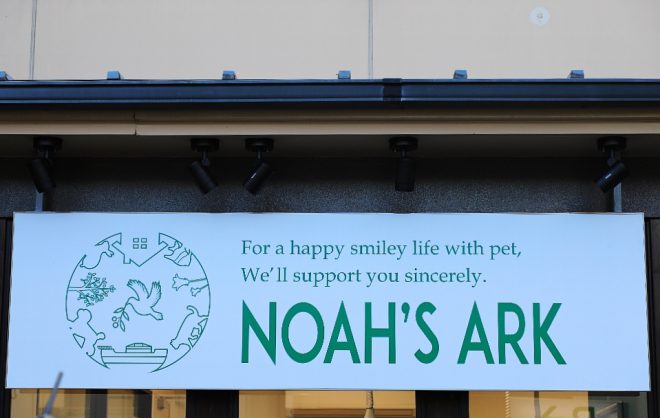 新しくなったノアズアークのロゴマーク。これまた北山通りの景観にもマッチしています。よくみると、エコっぽいグリーンがメインカラーです。ペットも人間もひとつの地球に住まい、それが大きな輪になって世界平和につながれば。そんな思いが店舗名にも込められているようです。