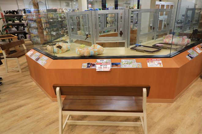 お店内の真ん中には、鉄道模型のジオラマコーナーを連想させるガラス張りのわんちゃんねこちゃんコーナー。木のベンチでゆっくりこころゆくまで眺めていてくださいね。もちろん気に入ったらお買い上げ~(笑)