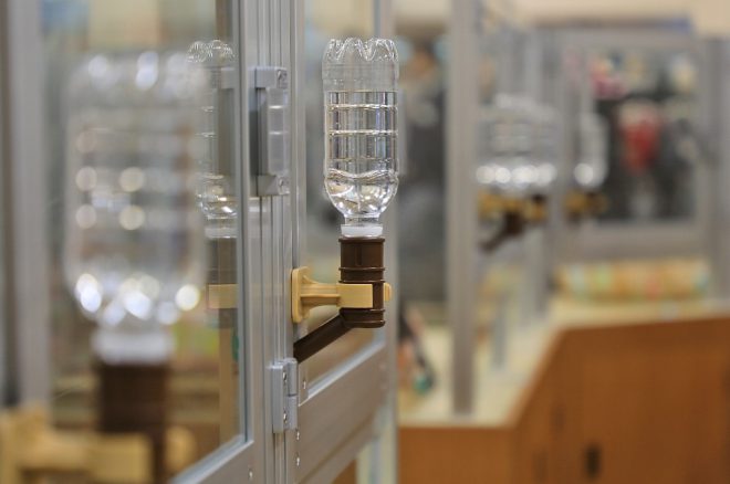 ペットショップでは珍しい簡易スライド式ロックを内部に採用。作業がスピーディーにできて、安全性もばっちりだそう。水飲み用のボトルも、手軽に高さを変えられるそうです。