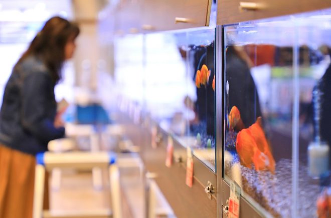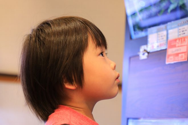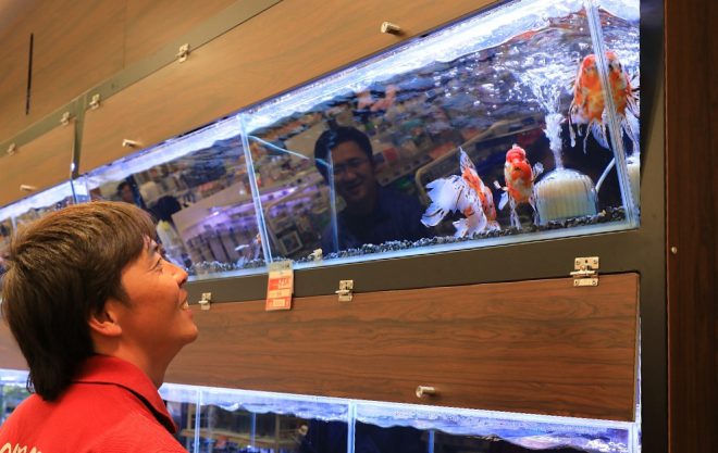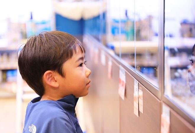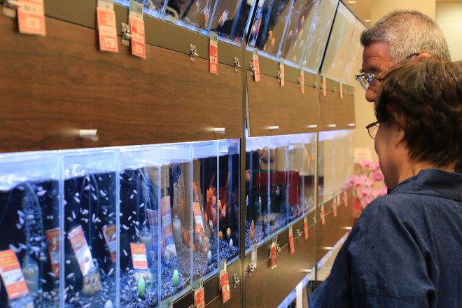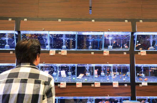 2人の男児と一緒に来店した男性。かれこれ2時間近く店内におられます。聞いたところによると、メダカを4匹飼っているのだとか。といえ、「まだ初心者なんです」(笑)と。飼い始めたばかりの悩みは、どんな用品がベストなのかという点。そんな時も、ぜひスタッフに声をかけみたら悩みや不安はきっと一発解消することでしょう。ちなみに、お父さんいわく本格的に飼うのはこのお子さんなのだそうです(笑)