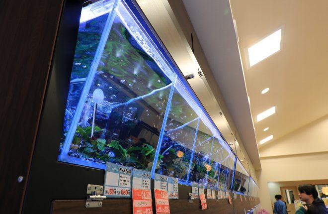ほかにもシクリッド系、メダカ、グッピーの姿も。「金魚一徹を標榜していますが、それだけではいけません。今後は熱帯魚に関しても、これまでのノウハウを駆使して色々やっていこうと計画中です。観葉植物を扱いたいという意見もあるので、それも北山店ではふさわしいのかなと思ってます。色々画策中です。まだ秘密ですが(笑)」と上村さん。これからの展開が大いに楽しみです。