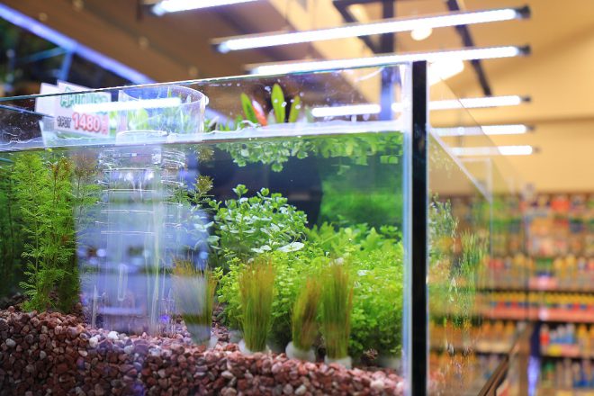 こちらは水草水槽。水草にもこだわりました。国産にこだわり、生産地にもこだわり、こちらは九州産の水草のオンパレード。