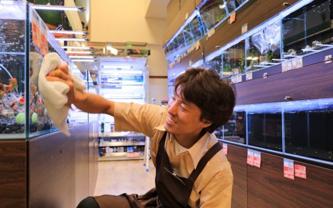 「やっぱりガラスの水槽は気持ちがいいです」と、またもやニコニコ顔の木村さん。これまではアクリルの水槽ばかり扱っていたので、ガラス水槽の透過性がやたら新鮮なのだそう。「掃除するのも楽しいです」と、取材中笑顔を絶やすことは一度もありませんでした。早くも自覚と責任が芽生えてきたに違いありません。