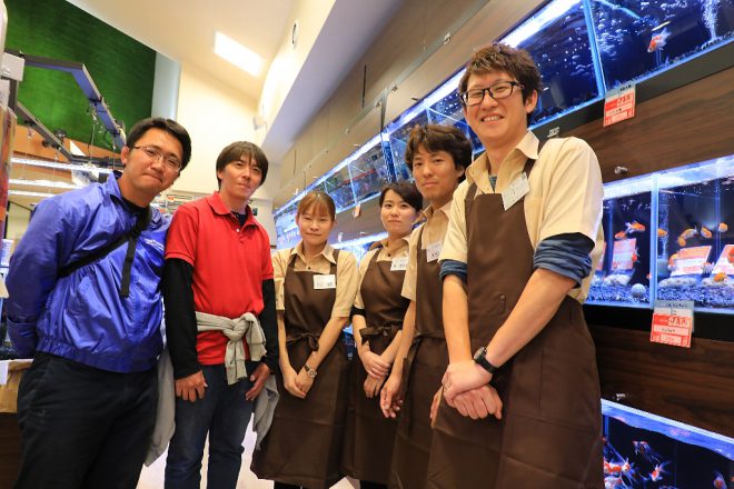 「お~い、アクアチームで写真撮るよ~」という川村さんの声がけでスタッフ集合。やまと錦魚園のスタッフも一緒に。