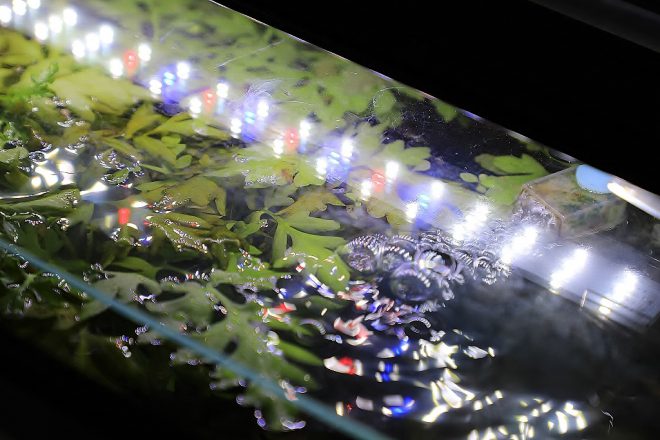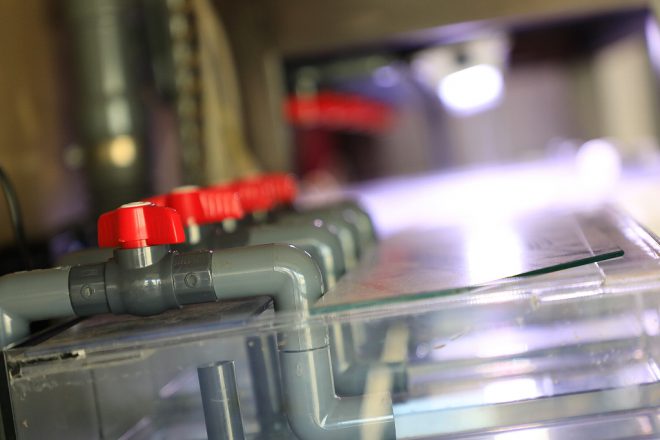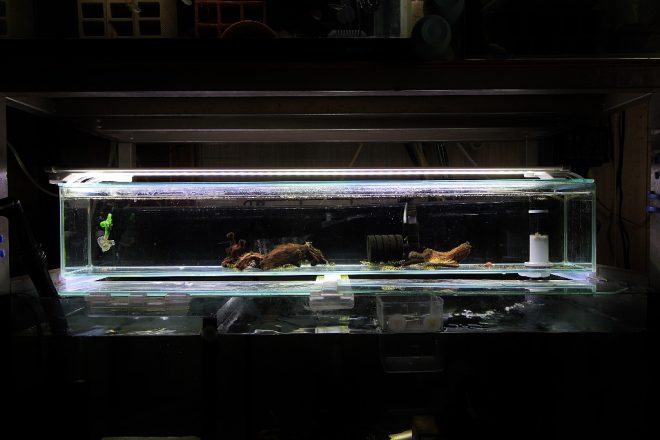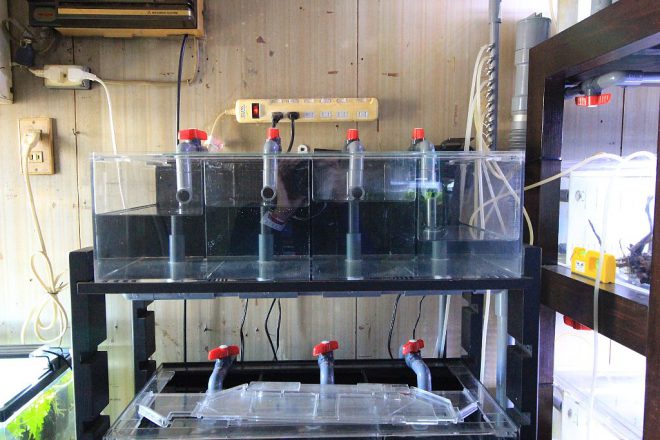 16室サイドフロー式。去年アクアショップに依頼してつくった自慢のオリジナル。後方に設置されたパイプを外すと半分の水が排水される仕組みです。