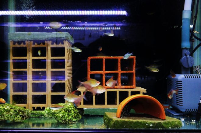 まるで魚のマンションのような水槽も。コバルトロージーなどのカラシンが心地よさげに泳いでいます。どの水槽も、野本さんの愛情が感じられて魚たちも快適そうです。