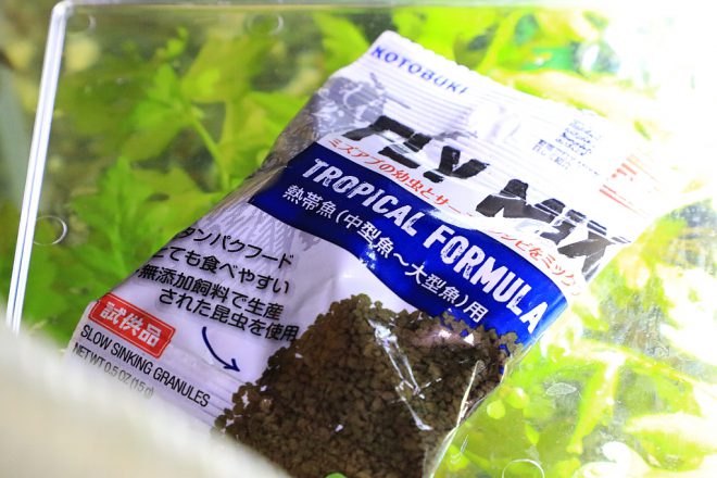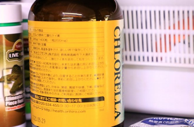 キンペコは雑食性。プレコ専用のエサ以外にクロレラも与えています。