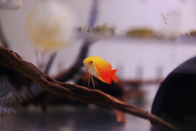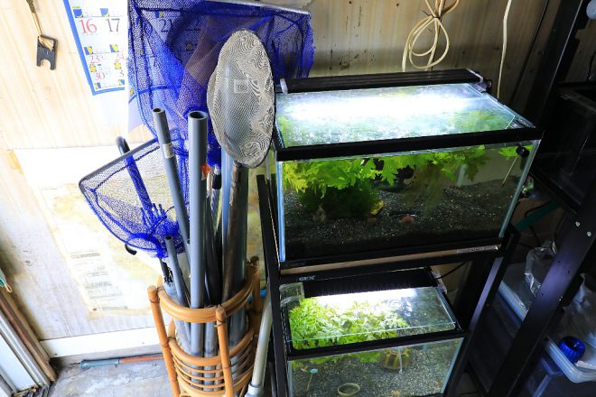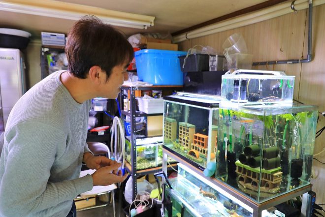 こちらの水槽には、かつてプラティがいました。繁殖が難しい出雲ナンキンと並行して、卵胎生のプラティも飼育していたとはちょっと意外でした。「これも夢中になりました(笑)。飼育していたのはライヤープラティという品種でした。尾びれや背びれの一部が伸びて、すごくカッコいい希少な品種だったんです。ところが、SNSに写真を投稿してみると欧米ではめっちゃウケるのに日本の人の反応はイマイチで(笑)」、オリジナルまでつくり出せたのに数年で飼育をやめたそうです。ちょっともったいない気がしないでもなかったり。