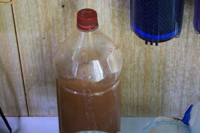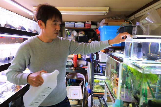 ただいまブラインシュリンプわかし中。生後間もない時はブラインシュリンプでOKですが、もう少し成長したらオカメミジンコに切り換え。「そういえば、昔はこのあたりでもミジンコがたくさん採れたんですけどね」。