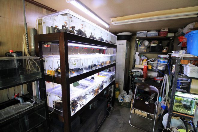 看板に偽りなし。元ガレージの内部は、まさに水族館。さまざまなサイズの水槽が所狭しと並んでいます。熱帯魚愛好家というより、繁殖家そのものです。よくみると、水槽の奥には電気温水器が省エネに貢献しています。