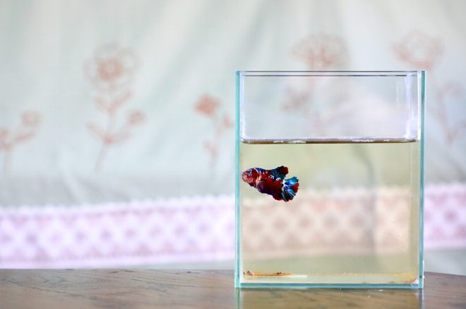 これも本邦初公開。ベッドにゴロリと横になった時の寿代さんの目線からはこんな風景が広がっていました。よくみると、種親候補生のオスがズラリと並んでいます。「ベタはすぐに人馴れする賢い魚なんです。仕事から帰ってきて部屋に入ると、みんながこっち向いてごはんをおねだりしてくるのが可愛すぎるんです(笑)!」