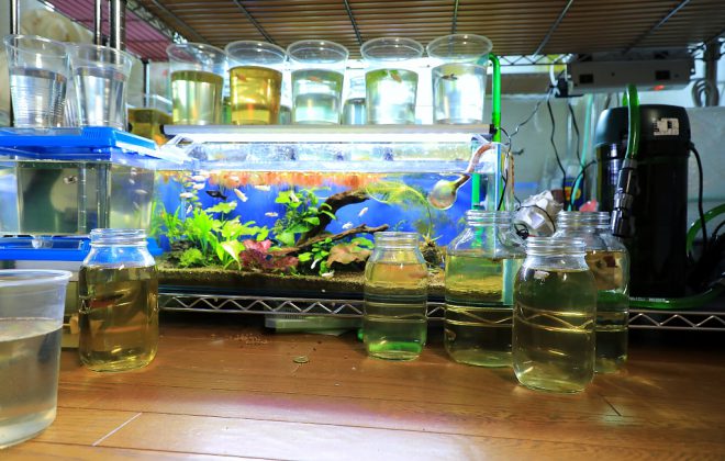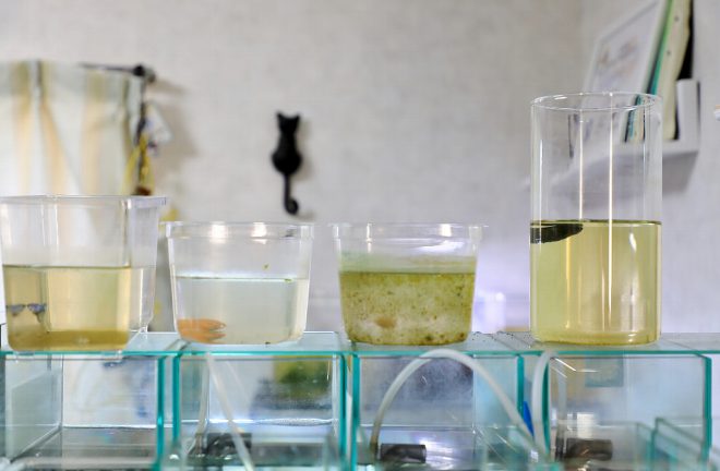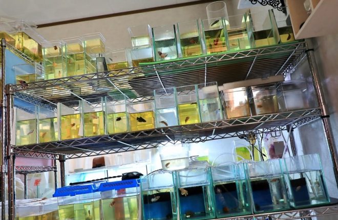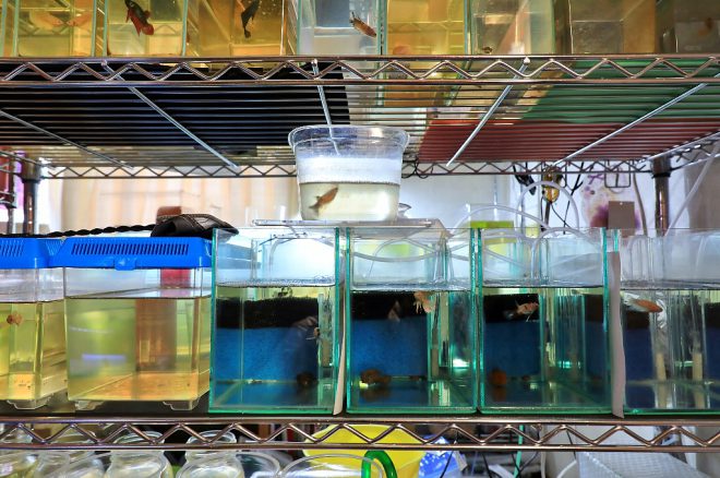 スチールラックなどに置かれたコンパクト水槽や、個別容器の数々。一体、何匹いるんでしょう。一匹一匹大事に育てて、くるべきお見合いの日を待っているのです。
