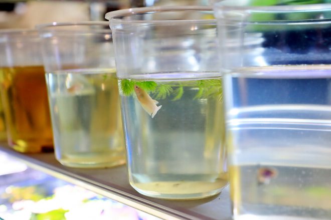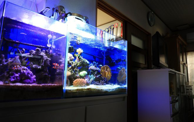 早速ベタを見せてもらうことに。あれ?海水の水槽?「これは、ベタの稚魚に与えるブラインシュリンプのためなんです。ブラインシュリンプを孵化させるための海水があれば便利だし、同時に海水魚飼育も楽しめます(笑)」。なるほど、二足の草鞋というわけですね(笑)。あくまでベタありきのアクアライフ。さすがです。