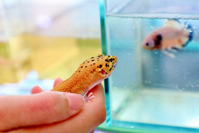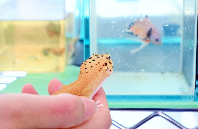 寿代さんがレオパ君をベタに近づけてみると。。。あら不思議!闘争本能をむき出しにするのかと思いきや、一気に後ずさり。レオパ君が闘魚でもかなわない強敵だったとは、意外でした(笑)