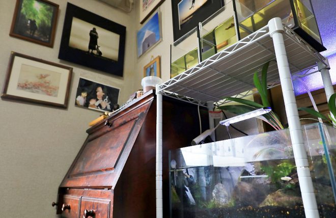 繁殖用のコンパクト水槽や容器とは別に、1階と2階にそれぞれ2つの水槽があります。いずれも、選別もれのベタが混泳。「コンテストレベルではダメでも、観賞用としては十分なレベルの個体に関しては、若いうちに親しいショップに持ち込んで販売してもらっています」と、選別もれした個体の行く末もちゃんと見届けています。「ショップにベタがいることで、ベタに興味を持ってくださるお客さんへのアピールにもなりますから」と、ベタの普及を意識している点は、地域一丸となって大豆づくりに貢献してきた寿代さんらしい一面でもあります。