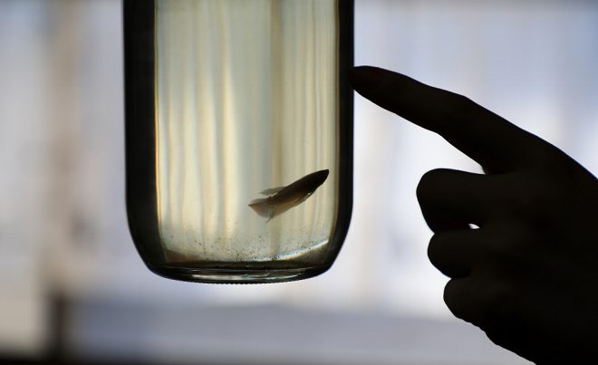 取材の最後に見せてくれた、小さなビンに入った小さなプラカット。よくみると、メダカではよくあるスモールアイという品種。寿代さん曰く「黒目が小さくて可愛く、今のところベタでは認められてない品種ではありますが、お気に入りなんです」と、やさしいまなざしでガラス越しのプラカットをみつめていたのは、ブリーダーではないひとりの女性の目線そのものでした。コンテストに出品できてもできなくても、深い愛情を注ぎ込んで手塩にかけていく信念こそ真のブリーダーとしての資質かも知れない。そう語りかけてくれているような気がしました。