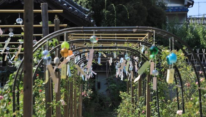 メダカの学校は今年3月に開校。このことをまだまだ知らない人もいるようです。デートスポットにもよさげな様相。以前この場所もバラが咲いていましたが、メダカのために道を譲りました。風鈴の回廊も多少カットして、以前より日当たりがよくなりました。