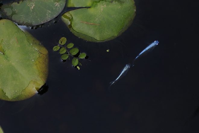こちらも夏っぽいアオメダカ。爽やかなブルーが美しく、改良品種として昔から親しまれてきました。太陽の下だと、なお一層美しさが引き立ちます。