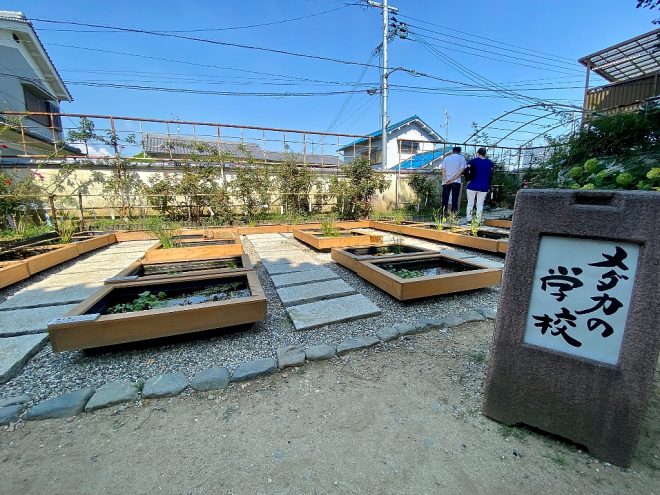 風鈴の回廊を抜けると、今までと風景が一変。新しくつくられた、メダカの学校とのご対面となりました。