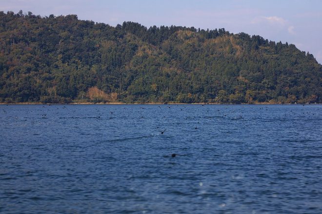 船が通るたびに、たくさんのカイツブリがいっせいにバタバタ。ありがとう、道を空けてくれて(笑)。この付近はカイツブリだけでなく、トンビやカワウなどの野鳥がたくさん生息しています。鳥たちにとっても格好の漁場なのでしょう。