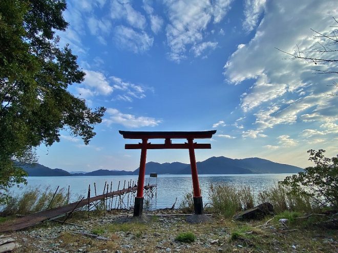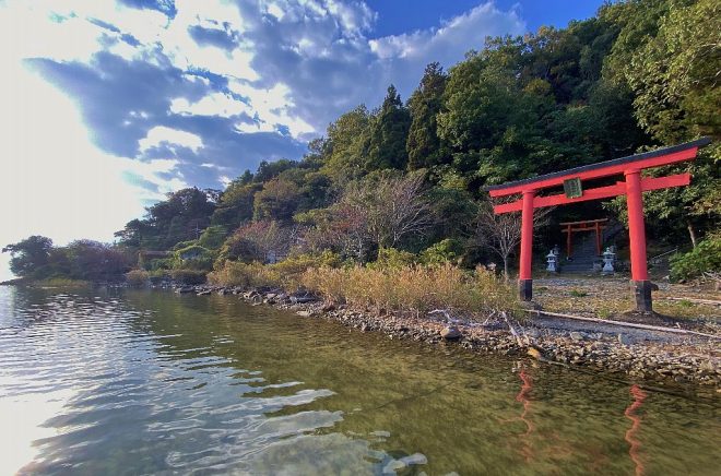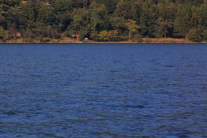 湖岸に建つ朱色の鳥居が印象的です。せっかく島へ上陸するのだから、ぜひあの場所まで行ってみましょう。