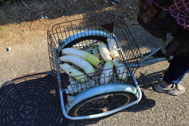 沖島の歴史に大きく貢献した女性(笑)。荷台には、収穫したばかりのだいこんがありました。