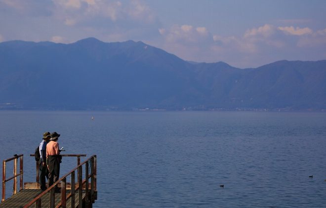 こんな絶景とも遭遇しました。かつてはびわ湖の観光船が停泊していた桟橋の跡。目の前に広がるのが比良山系。もうすぐこの山々にも雪が降り、厳しい冬を迎えます。
