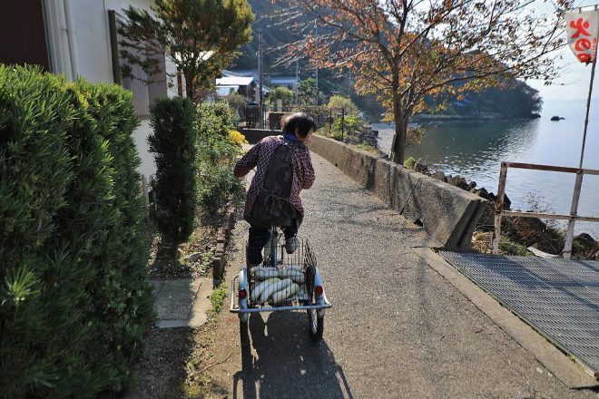 またひとり三輪自転車で軽快に走る女性と遭遇。何と島で初めて三輪自転車に乗った記念すべき第一号なのだそう。えー、それはすごい!聞いてみると、42年前に近江八幡市の知り合いの勧めで入手。すると、これは便利な乗り物だとたちまち島民の間で広がり、いつのまにか三輪自転車が島の代名詞のようになってしまったのです。