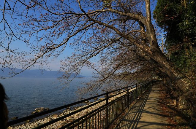 通称・桜のトンネル。春になると、桜吹雪が湖岸を舞う島の観光スポットです。