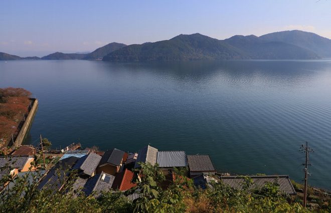 奥津嶋神社から見たびわ湖。まるで対岸が離島であるかのような、まさに絶景というほかありません。