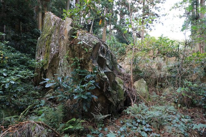 おお、これは!高さ3mはあるでしょうか、こんな巨石がいくつも転がっています。いや、転がっているのか山から落ちてきたものなのかは不明ですが、沖島は明治から昭和の40年代ごろにかけて石材業が盛んだったことを思い出しました。もしかしたら、これらはその名残なのかも知れません。