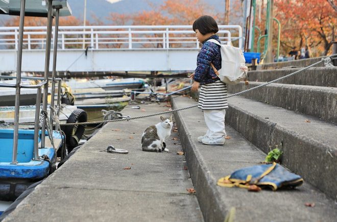 帰りの船を待つ間、ネコと戯れる女の子がひとり。同じ滋賀県からママ友と一緒に2家族5人で来訪。取材中もすっかり仲よくなり、「くーちゃんのおうちにも来てね」とラブコールを送られてしまいました(笑)。