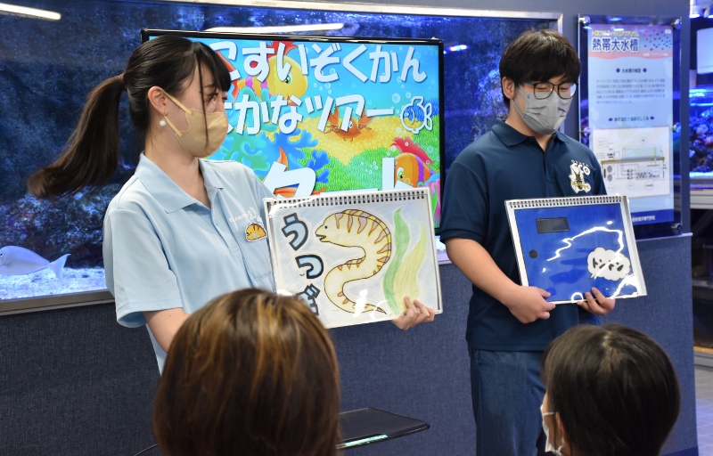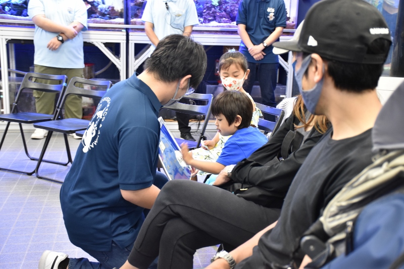 お姉さんの味のりたちはクマノミについてのクイズ。どんなクイズを出したのかは写真から想像してみてください(笑)。