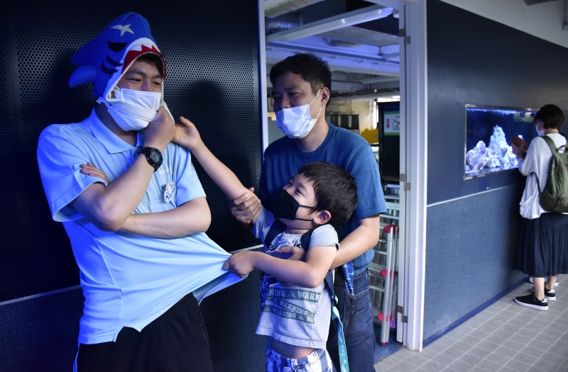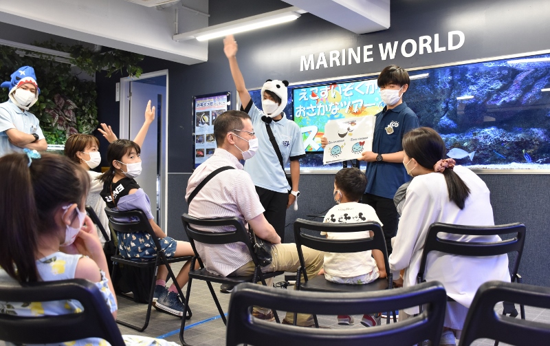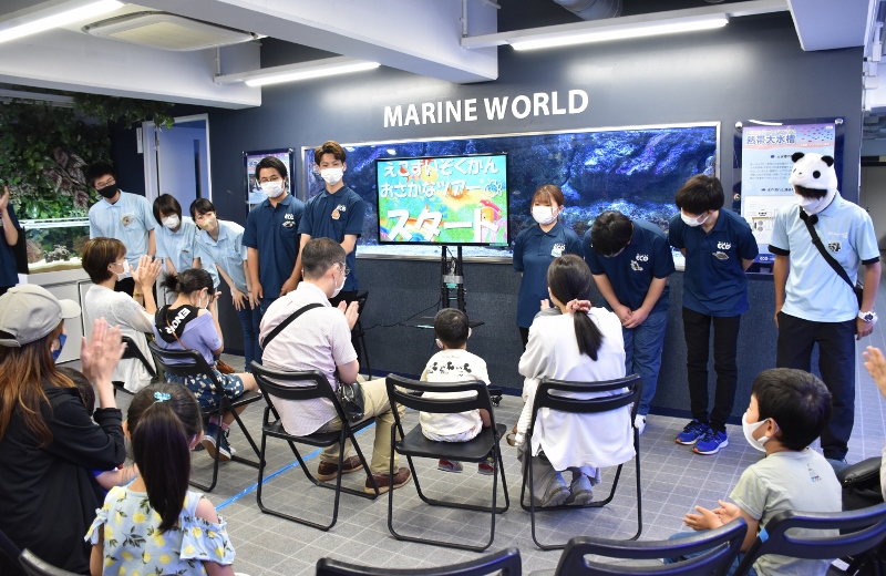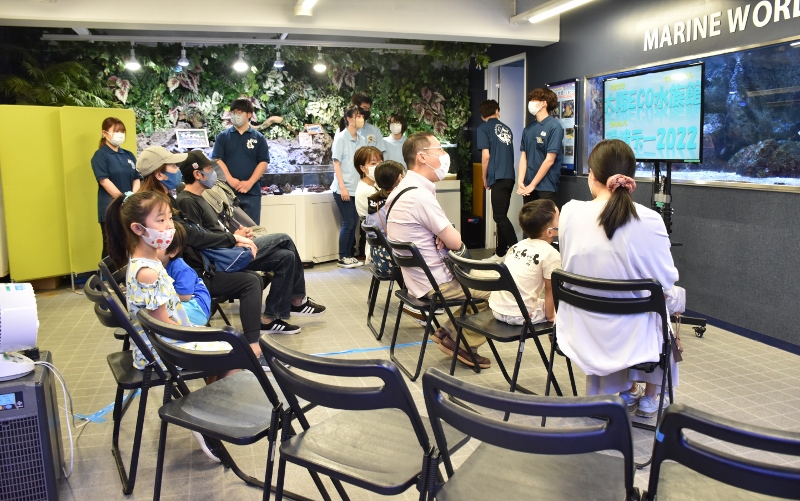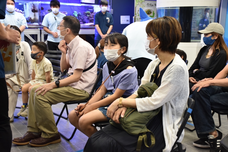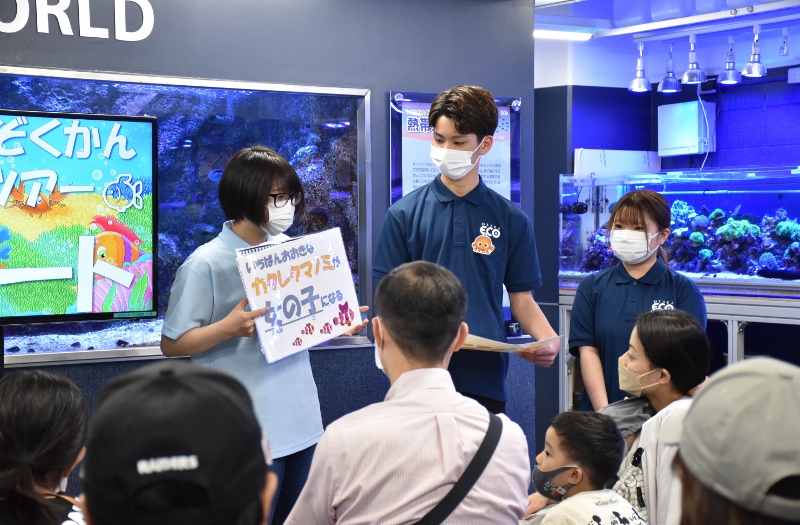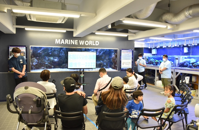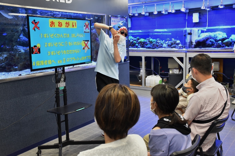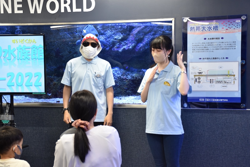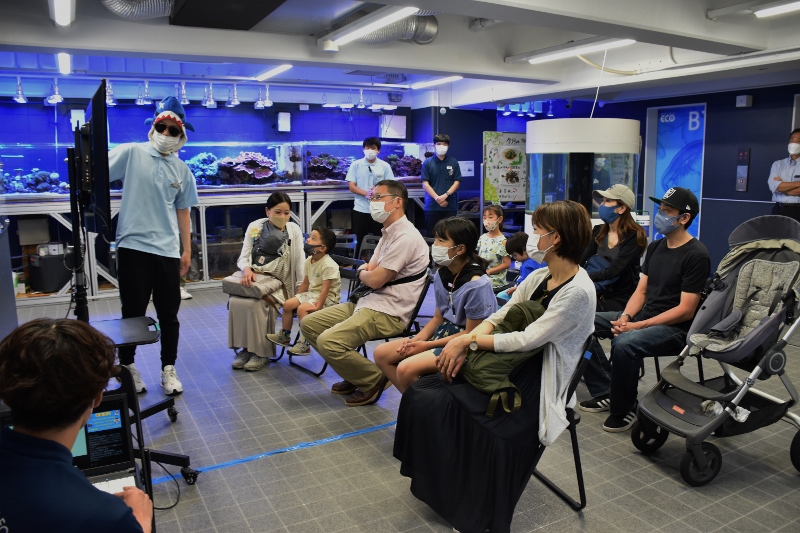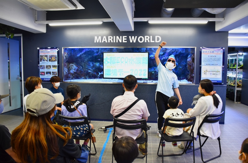 「それでは大阪ECO水族館環境デー2022を開催するぞ!~。まずはおさかなツアーからだ~!」。シャークの雄叫びが水槽教室に響き渡りました!