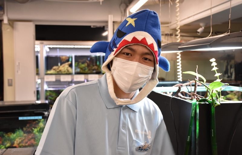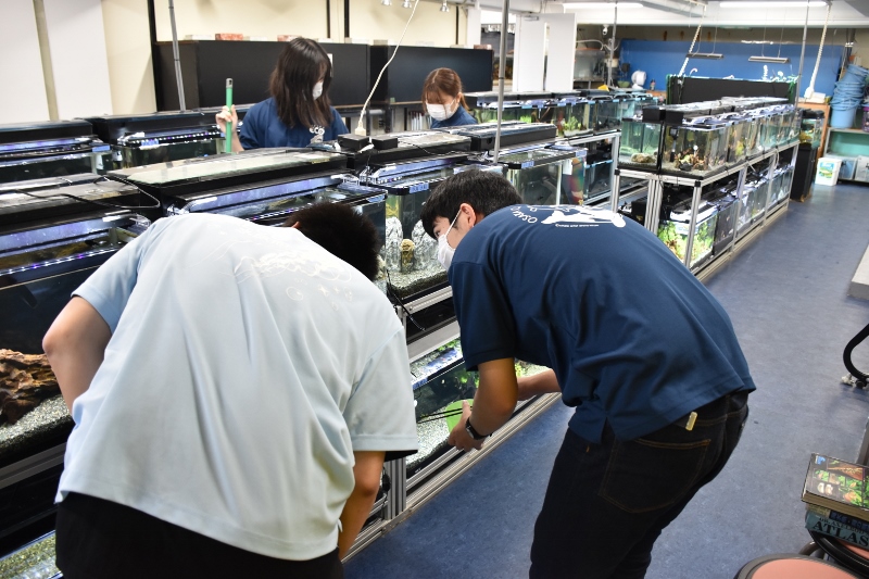 無事に定員に達したことへの安堵とともに、初イベント当日は写真から緊張感が。伝わってきているでしょうか。当日は朝一番から生体の健康チェックから。もちろん水槽に汚れがあれば掃除もセッセと。この朝の作業は、将来アクアショップや水族館に就職しても同じような作業を行います。とはいえ1年生とは普段の学校生活でかかわることが少なく、写真を撮られ慣れていないこともあってあまりこっちを向いてくれませんでした。悲しい~(笑)。
