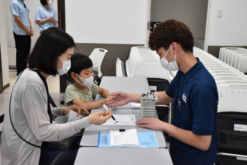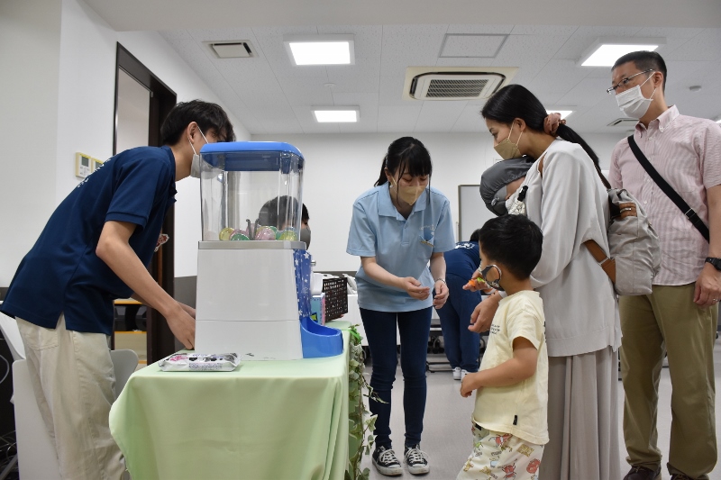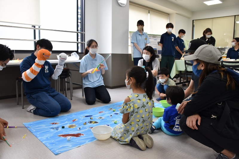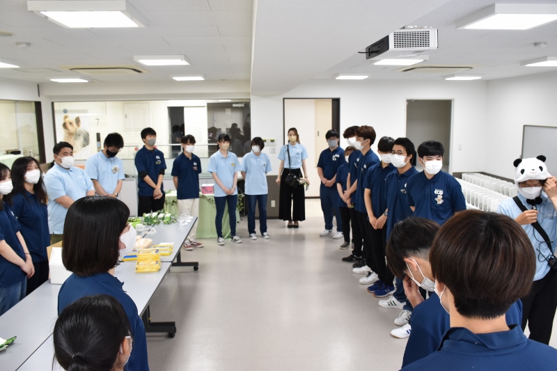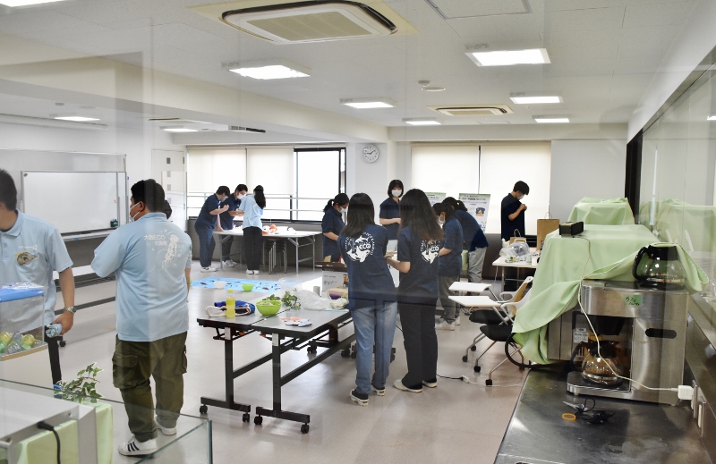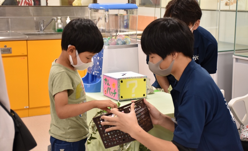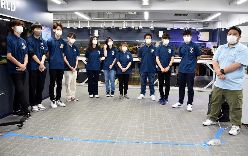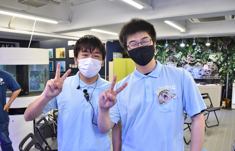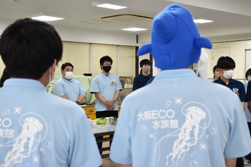 以前にも、ECO水族館(通称・エコ水)の取材に来て頂いたことがありますが、当時のメンバーは卒業してしまい現在はいません。紺色のポロシャツ着用はエコ水新メンバーの1年生たち。表情がまだ硬いかな?水色のポロシャツを着ている彼は2年生の「とらちゃん」。貫禄があり、安心感を与えてくれる存在(笑)のとらちゃんでも大きなイベントに参加するのは初めて。みんな揃って予約の電話が鳴るのか不安がっていましたが、地域の方へのチラシ配りやSNSでのPRの結果、なんと!わずか1週間で定員に達しました!新メンバーはまだ顔なじみがないと思いますが、エコ水って意外と人気で、リピーターさんもたくさんいるんやで(笑)!