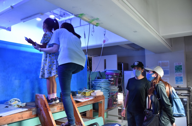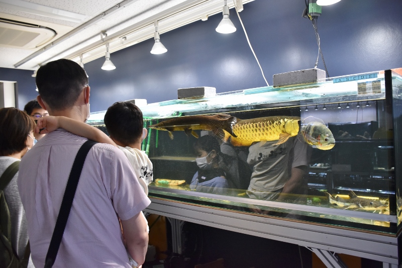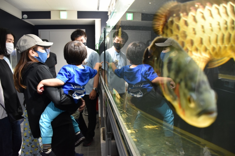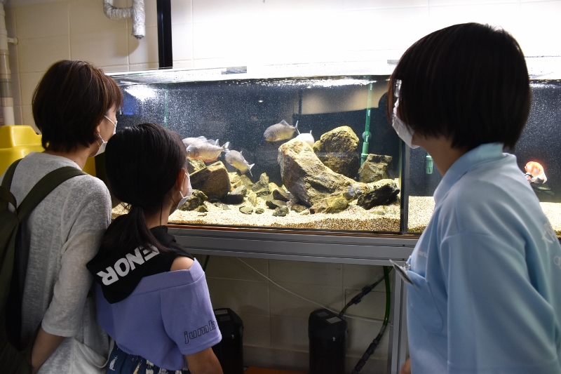 なかなか見る機会のない大水槽の裏側をのぞいたり。そのほかにも、ピラニア水槽やサンゴ水槽も堪能してもらいました。