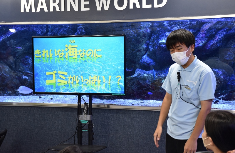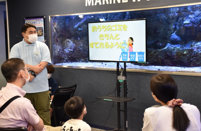 今回のイベントでは、地下の水槽教室でお魚解説と環境問題の一つでもある「漂着ゴミ」についてレクチャーが行われ、7階ではゴミを使った手づくりキーホルダーやハガキづくり体験の会場となりました。ということは、スペースも内容もいつもより倍増!きっと喜んでいただけると確信しました。