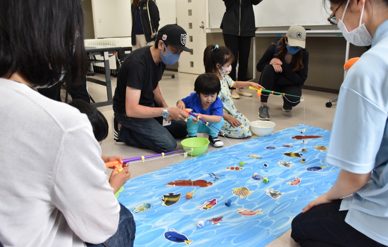 釣り竿で魚を釣るのではなく、プラスチックごみを釣り上げて海をきれいにするのがミッション。子どもたちが竿を海に串刺し!お父さんが「いや、ちゃうちゃう」とすかさずフォロー(笑)。無事にゴミのペットボトルのキャップを釣り上げることができました。