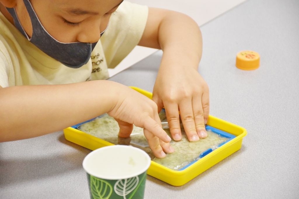 次のコーナーでは、授業の水草水槽でトリミングカットしていらなくなった水草とトイレットペーパーを使ってハガキづくり。