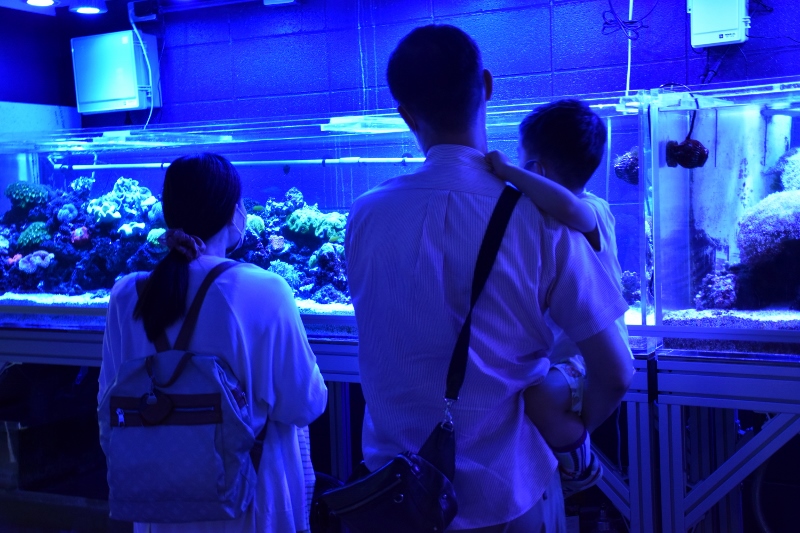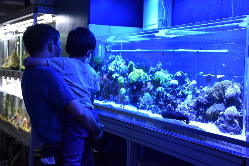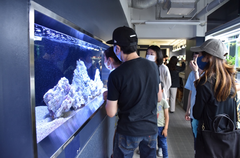 水槽教室の中でも特に人気のあったサンゴ水槽。お客様の感想でも、「サンゴ水槽のライトアップがきれいでお魚も元気に泳いでいて一番印象に残っています!」という声が多かったです。
