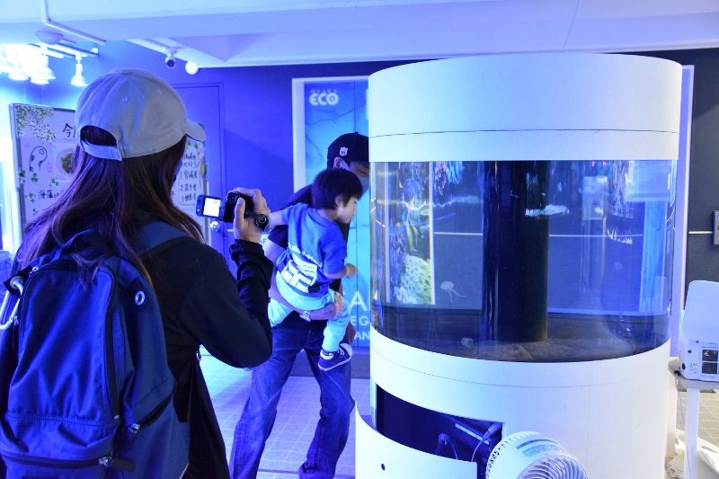 クラゲ水槽に見入るご家族。お父さんが男の子を抱っこしてクラゲを見せてあげ、お母さんがその様子を撮影する。3人のいい思い出になったかな。撮影してくださったお母さんは写真には写らないけど、男の子がその時に見たお母さんの表情やしぐさを思い出としてずっと忘れないでほしいと思いました。