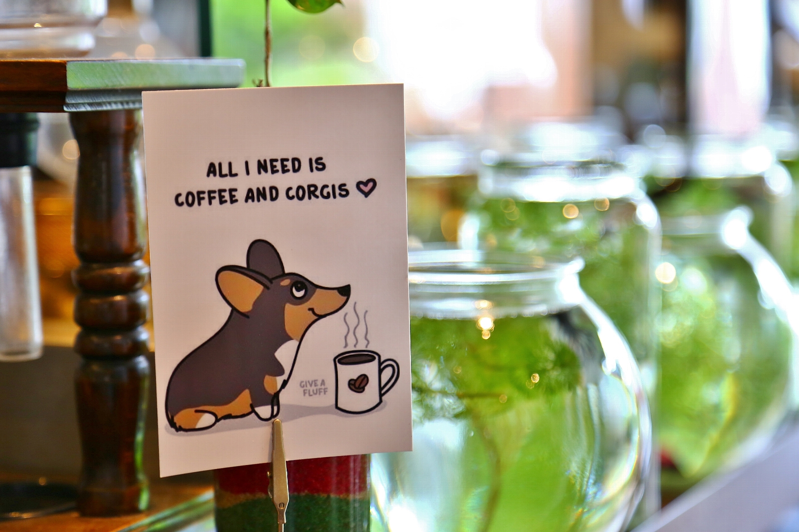 やおらコーギー犬のくうちゃん登場。ベタ同様、お店のオープン当初からいる人気者の看板犬です。Facebookやインスタグラムなどのおかげで、今ではすっかり全国的に有名になりました。