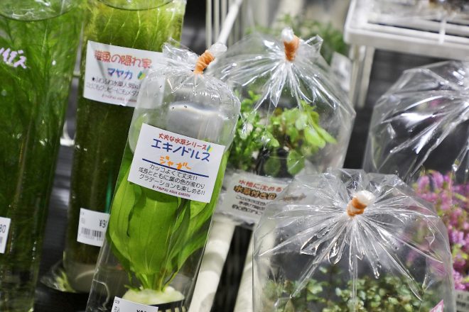 ほかにも水草の種類がたくさん。銀座というハイセンスなまちにあって、ここには自然がいっぱいです。「実は、数年前までわが家にも水槽があって、どちらかというと水草をメインとした水槽だったんです」。いわゆる水草水槽。だからこんなに水草の種類も在庫も豊富なんですね。藤森副店長のカラーに、早くも触れることができました。